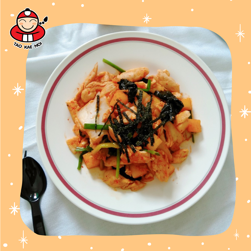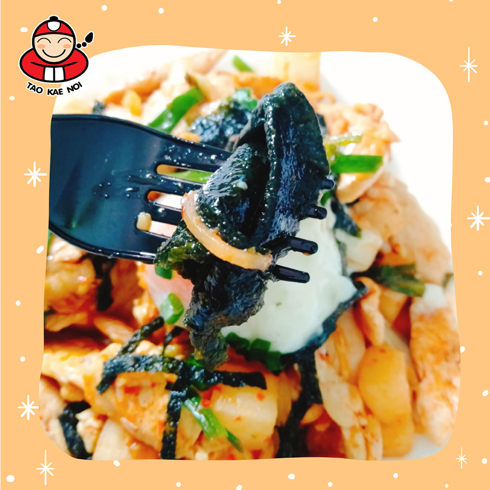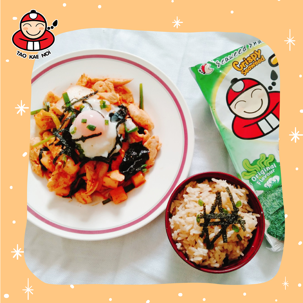 Step4:將香脆小老板海苔弄成片狀放入鍋內,隨後快速翻炒。
